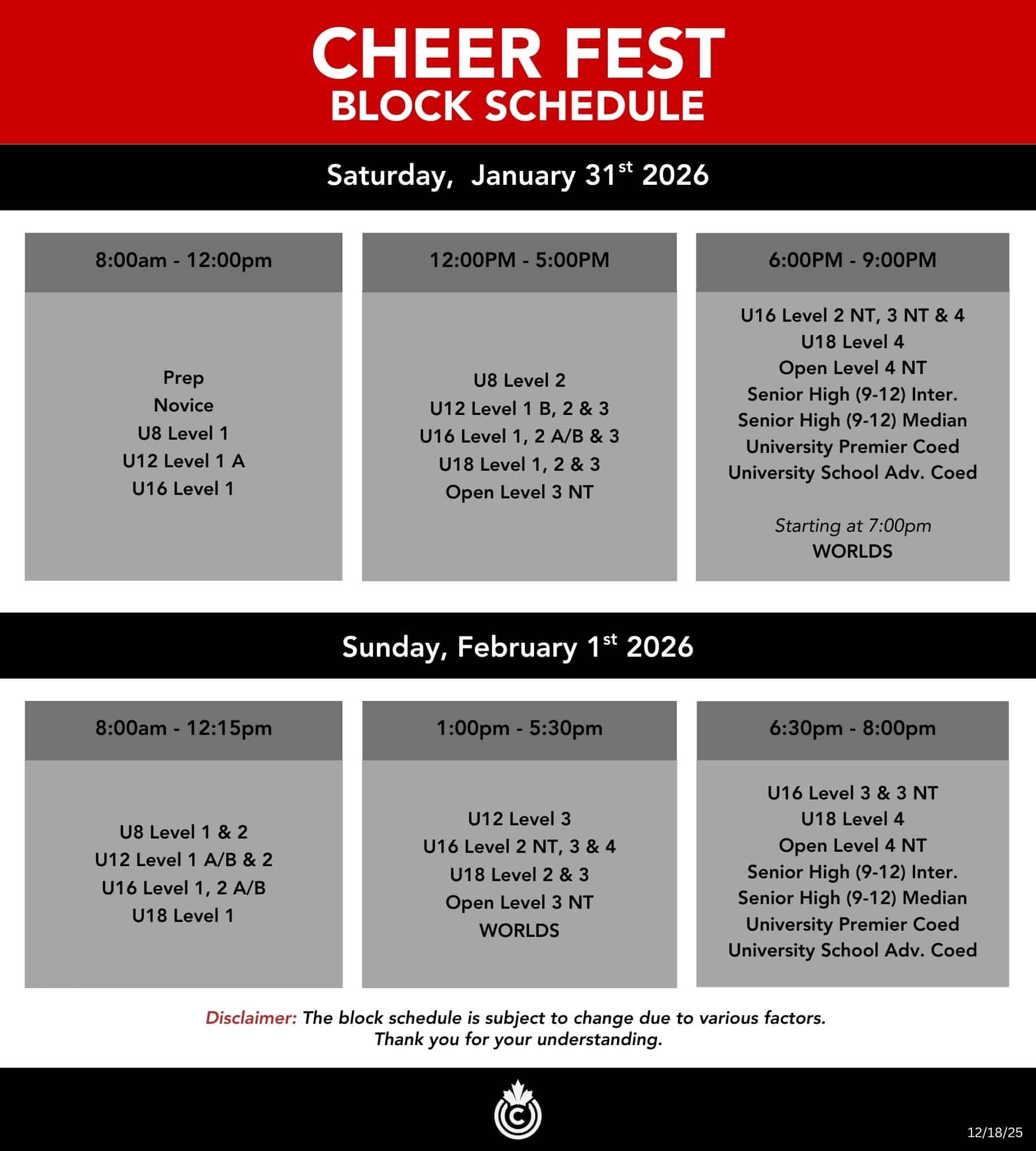 - Although all Canadian Cheer events are known for being run on time, unforeseen circumstances sometimes cause times to shift slightly. Last minute schedule changes and team performance times can shift without them being posted here. Spectators, please be aware there may be a change in the performance time of the team you came to watch. We will always attempt to ensure that this does not affect any teams negatively.