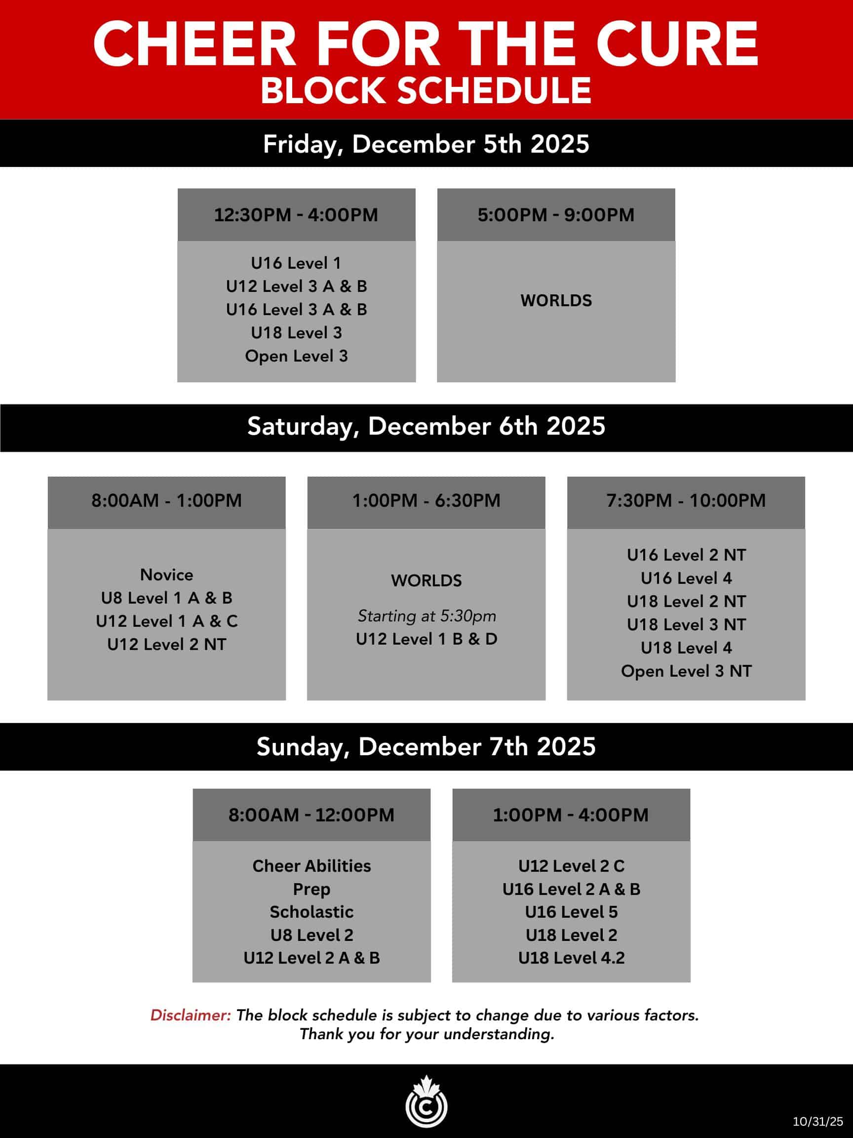 • Although all Canadian Cheer events are known for being run on time, unforeseen circumstances sometimes cause times to shift slightly. Last minute schedule changes and team performance times can shift without them being posted here. Spectators, please be aware there may be a change in the performance time of the team you came to watch.  We will always attempt to ensure that this does not affect any teams negatively.