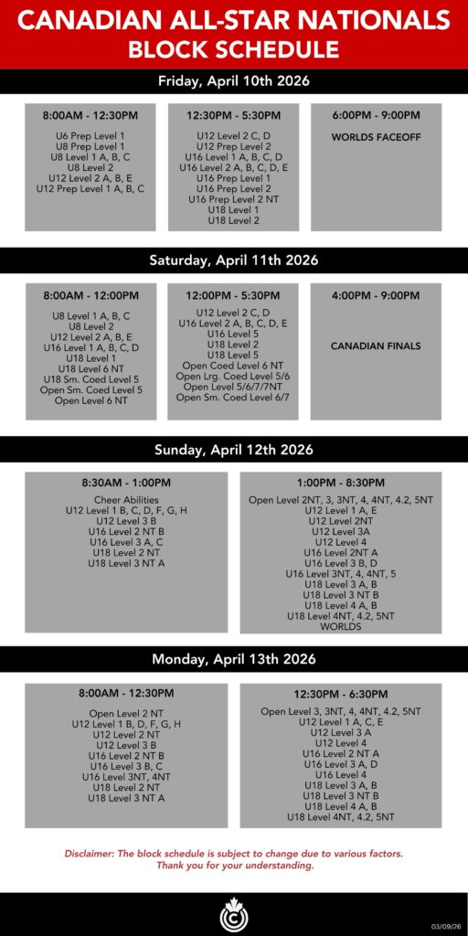 - Block schedules are created based on event registration data. To allow gyms sufficient time after tryout season, registration for all Canadian Cheer Events will open in late July/early August 2024. We aim to release a block schedule by Fall 2024.