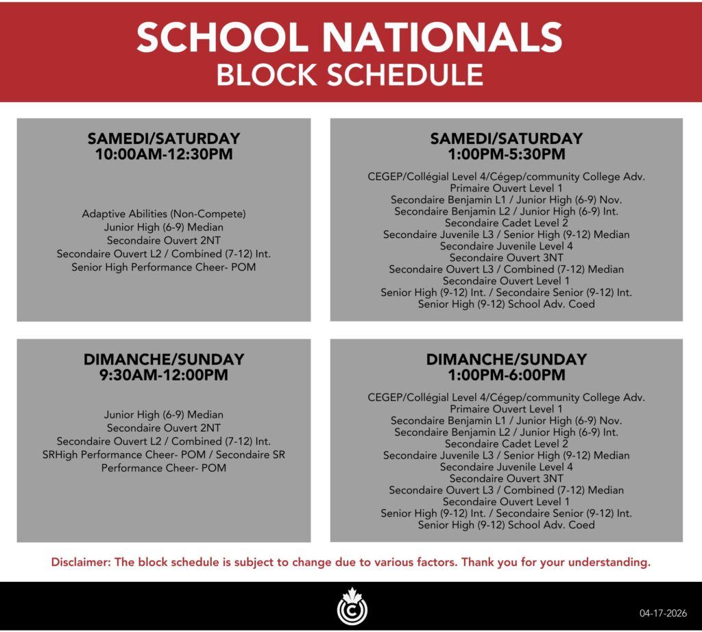 - Although all Canadian Cheer events are known for being run on time, unforeseen circumstances sometimes cause times to shift slightly. Last minute schedule changes and team performance times can shift without them being posted here. Spectators, please be aware there may be a change in the performance time of the team you came to watch. We will always attempt to ensure that this does not affect any teams negatively.